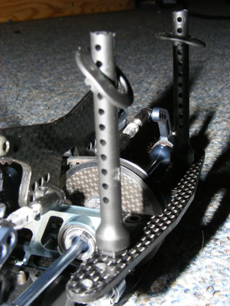 Die Karosseriesteher von Corally sind eine Glaubensfrage. Standartmäßig sind sie schraubbar. Dies hat zwar den Vorteil, daß die Höhe der Karosse stufenlos justiert werden kann und man keine Clipse verlieren kann, hat aber auch den Nachteil, daß die Schrauben manchmal etwas friemelig aufzuschrauben sind, was gerade während des Rennens teilweise sehr nervig ist. Zum Glück kann man aber auch die Steher verschiederner anderer Hersteller nehmen. Es passen z.B. die des Hot-Bodies Cyclone oder die von mir verwendeten vorderen Steher des XRay T2.